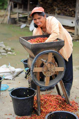 Further confusion arises with the term wet-hulled. Though Indonesia has produced wet-processed coffee (from Java, Bali, Flores, for example), a wet-hulled process is used in Sumatra and Sulawasi, which in the Bahasa language of Indonesia is called Giling Basah. These coffees tend to have more body, lower acidity and a characteristic bluish-green color. The cherries are picked and run through a hand-crank drum for pulping, which grates the fruit skin off the bean.
