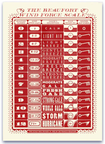 Sir Francis Beaufort of the Royal Navy standardized the scale that could be used by mariners to describe weather observations in the early 1800’s. Previously, one captain’s ‘gentle breeze’ may have been another’s ‘strong breeze’ (the first may have been in a schooner, while the other, in a small dory!). This original scale was concerned with the force of the wind on sailing ships.